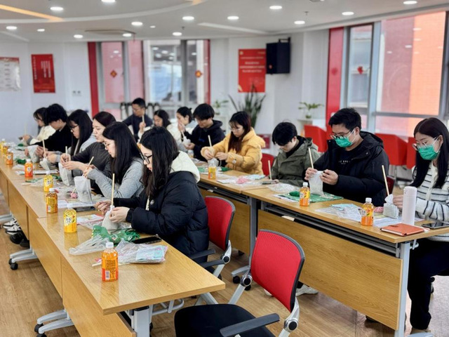 师生们齐聚一堂,共同体验了中华优秀传统文化的魅力——中草药艾草养生锤制作。艾草锤,是一种传统的中医养生工具,用来轻轻敲打身体,可安神理气,疏通经络,祛湿散寒,以舒缓肌肉紧张和促进血液循环。在志愿者的协助下,导师和研究生们齐心协力,装艾草、裹花布、缠麻绳,一个个外观精美、独具特色的艾草养生锤逐渐成型。制作过程中,导师和研究生们不时交流心得、分享经验。